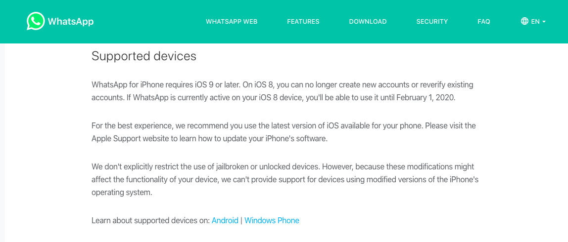 WhatsApp mengatakan: "Anda tidak akan dapat lagi menggunakan semua sistem operasi Windows Phone setelah 31 Desember 2019, dan WhatsApp mungkin tidak tersedia di Microsoft Store setelah 1 Juli 2019."